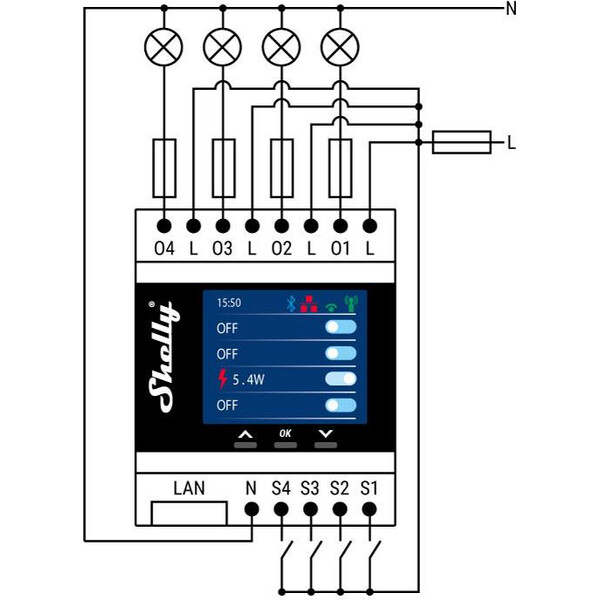 Shelly Pro 4PM is a one-phase, 4-channel relay, supporting up to 16A per channel with a total device capacity of 40A. Shelly Pro 4PM is equipped with four integrated precise power meters that allow you to control and monitor the consumption for each channel separately. Equipped with LAN, Wi-Fi, and Bluetooth connectivity, it allows for a more secure and reliable connection. Use scripting functionalities to set custom automation scenes based on various occurrences, weather forecasts, wind forecasts, etc.