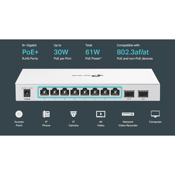 10× Gigabit Ports (8× RJ45 PoE+, 2× SFP)