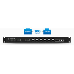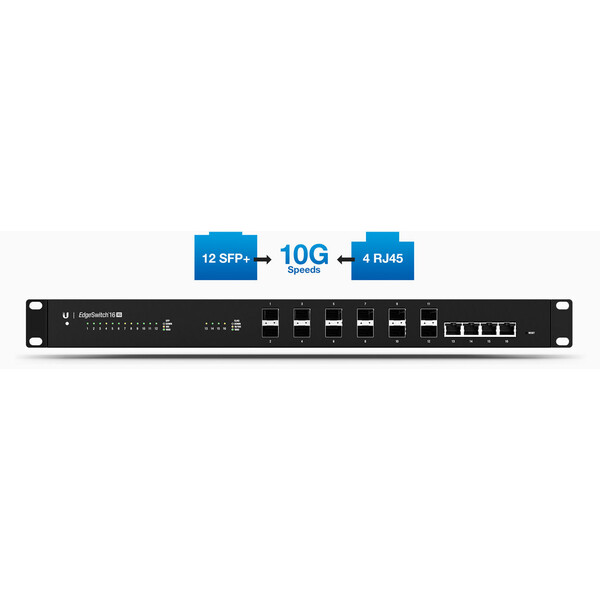 The EdgeSwitch features 12 SFP+ ports and four RJ45 10GBASE-T ports to efficiently deliver and aggregate data at 10G speeds.