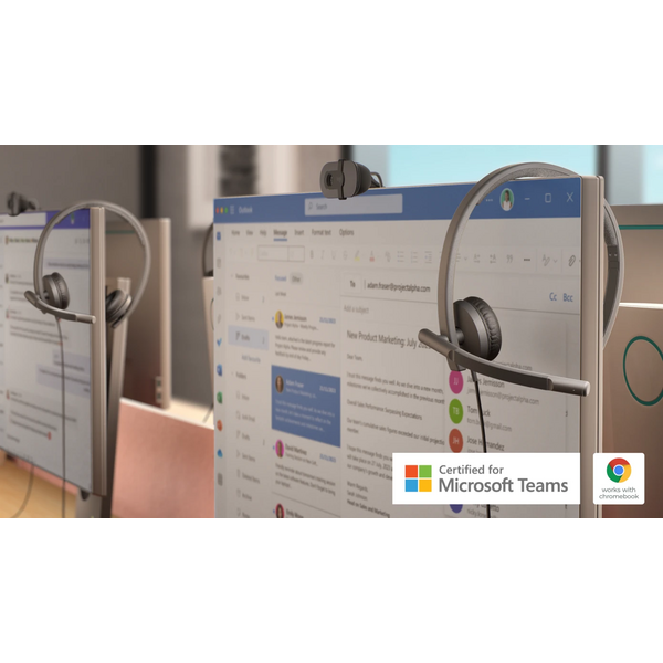 Logitech H570e is a hard-working business headset available in two versions — a Microsoft Teams-certified version with full Teams functionality, and a UC version that’s certified for Works With Chromebook and compatible with Cisco for audio.