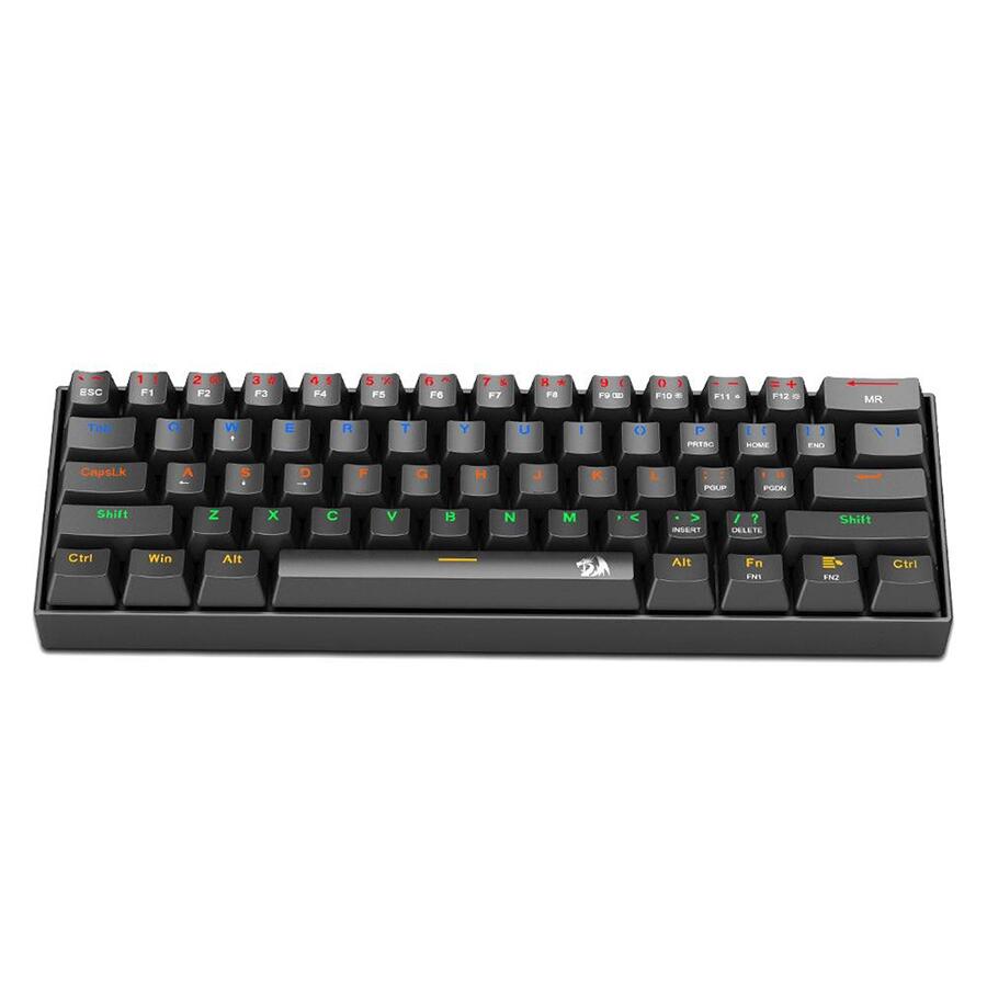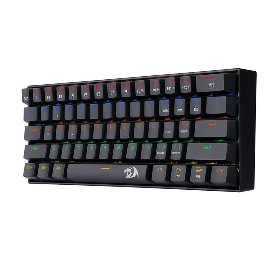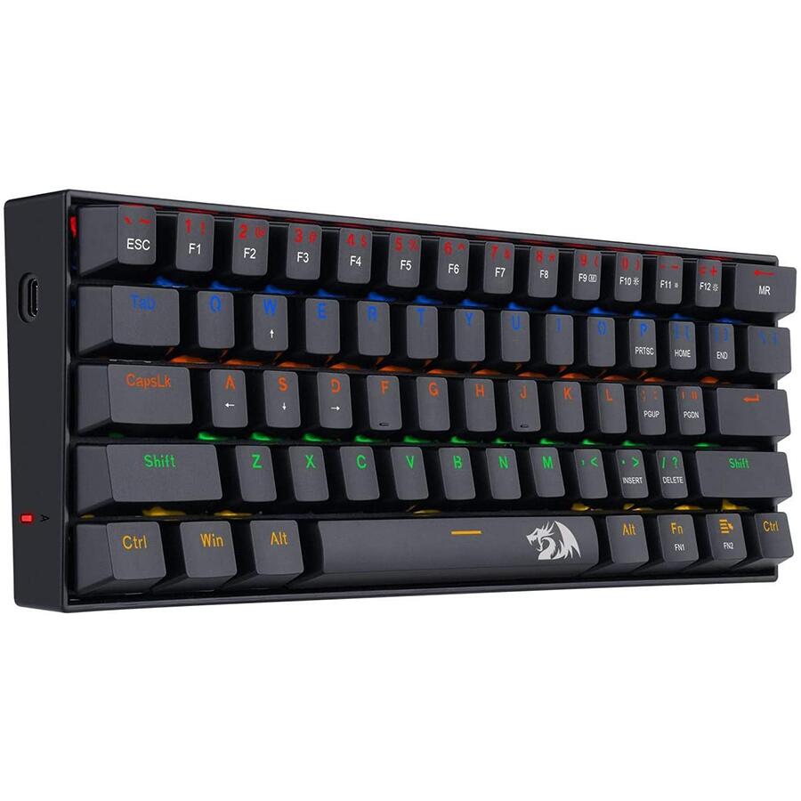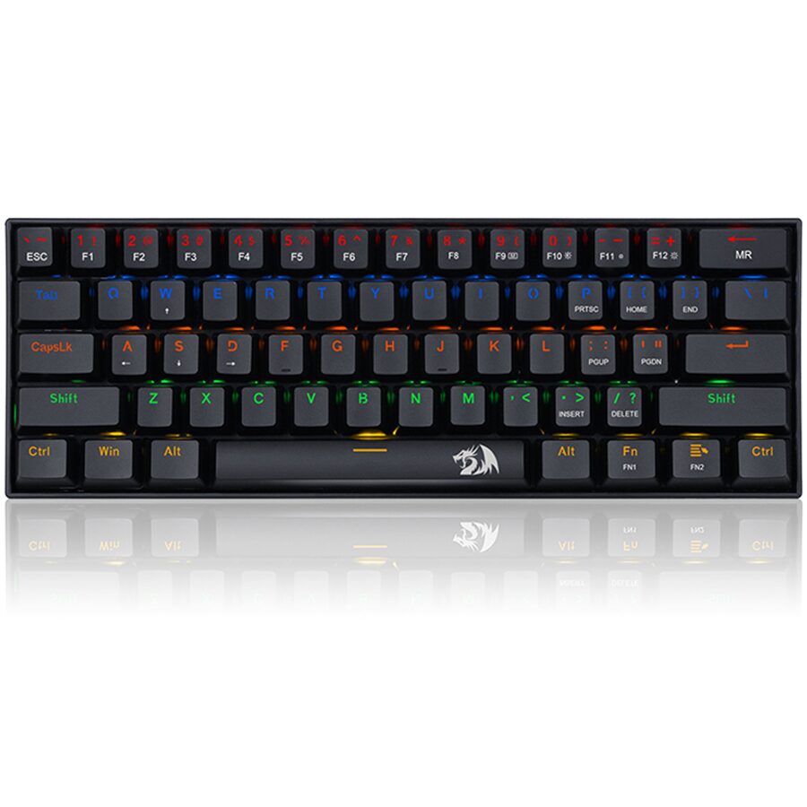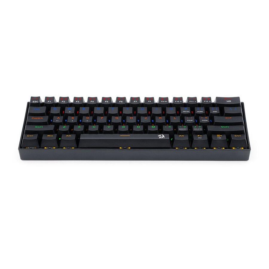 Mechanical gaming keyboard Redragon Lakshmi black Rainbow lighting red switches, all keys without conflict, 61 keys (n-key rollover), Redragon red switches (lifetime: 50 million presses), RGB LED lighting of the keys ( the possibility of adjusting the light intensity, 17 lighting modes), the WIN key can be disabled during games, the characters on the keys are not erased due to the double shot injection keycaps, detachable cable, USB Type-C connector, dimensions: 292x102x36mm, weight: 569g