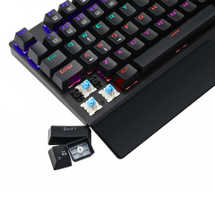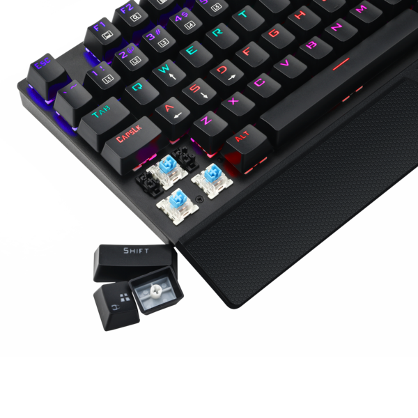 This keyboard has blue mechanical switches with 10 million click durability and double-injection keycaps.