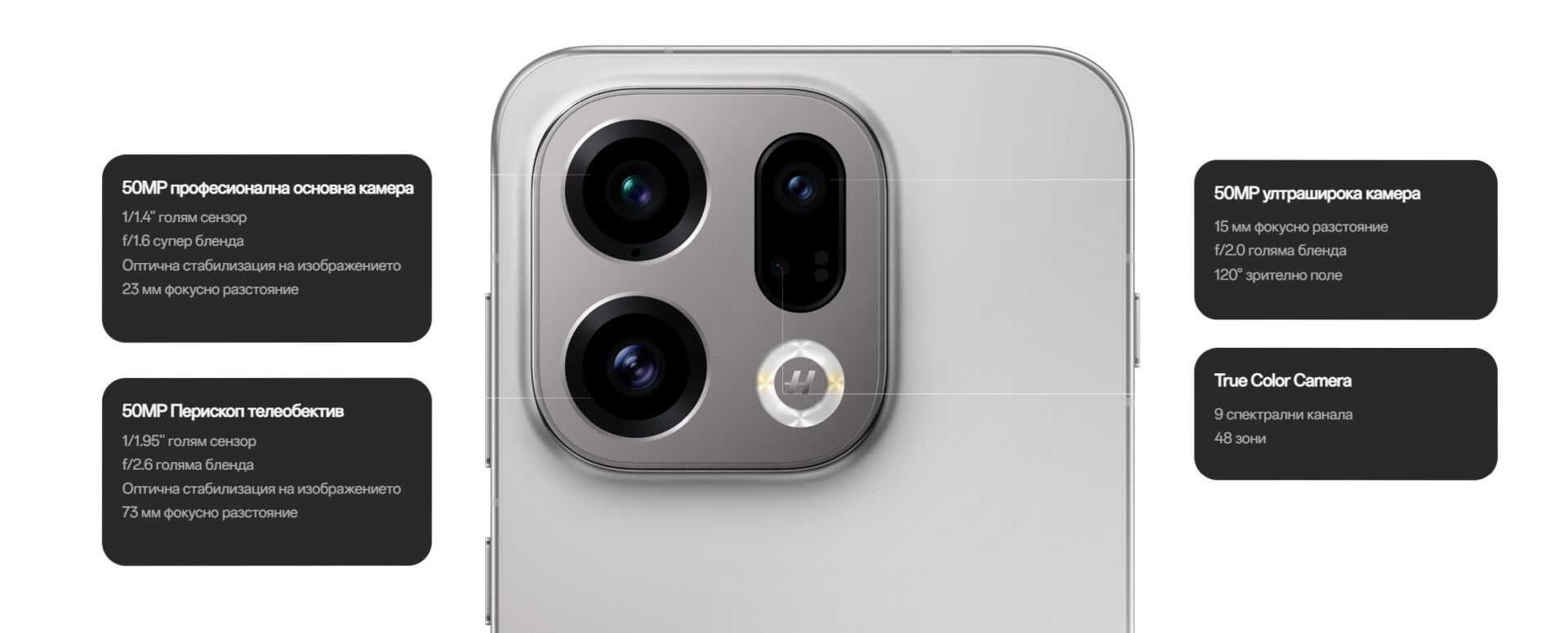 | Камера, задна | 50 MP (широк) + 50 MP (ултраширок) + 50 MP (теле) |