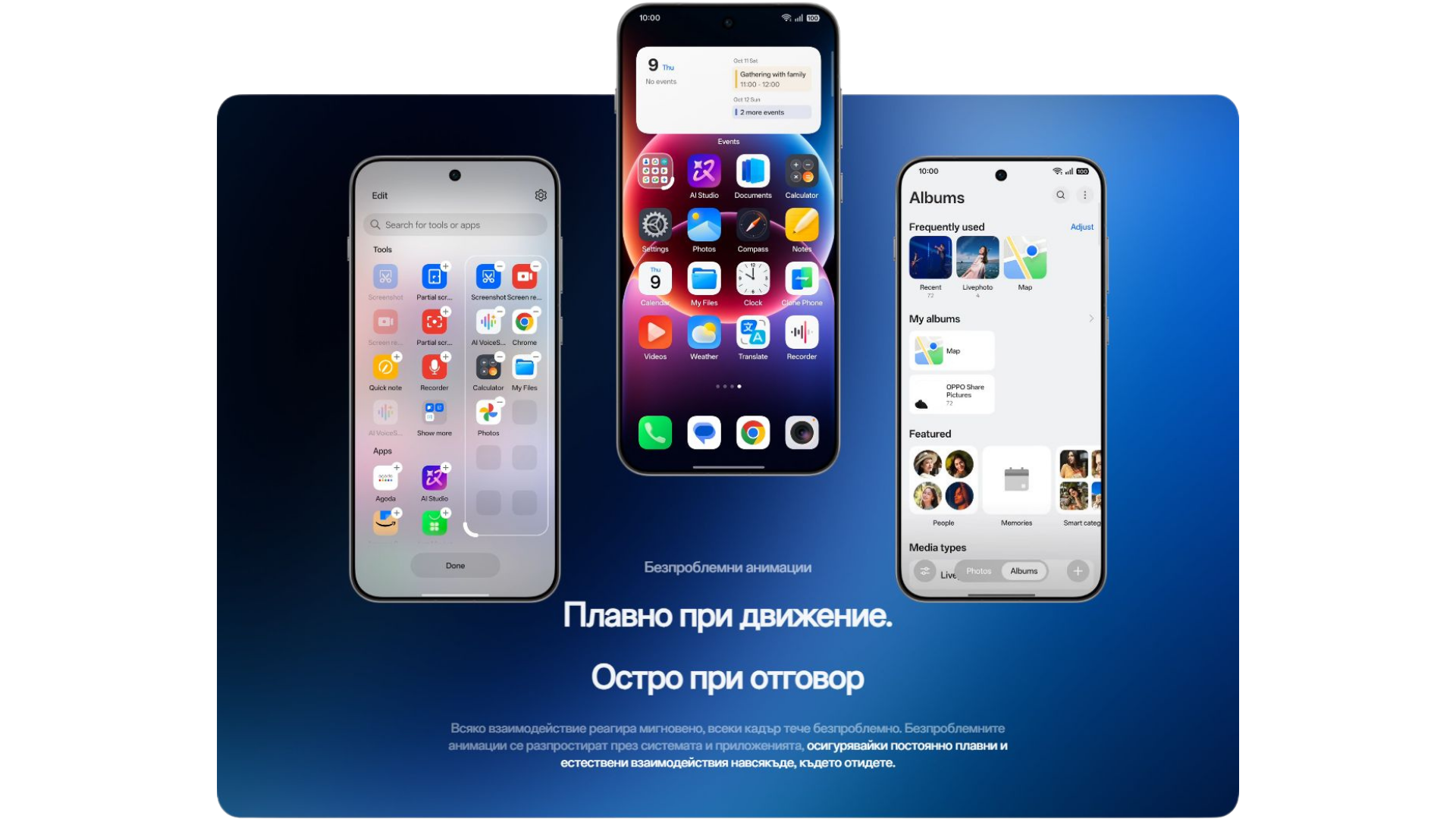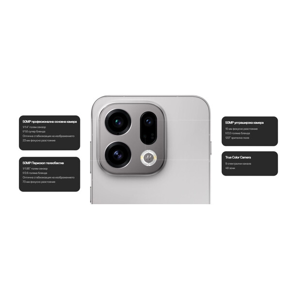 Екранът е голям 6.59-инчов AMOLED дисплей с Full HD+ резолюция и 120 Hz честота на опресняване за плавно скролване и висококачествено визуално изживяване. Find X9 има усъвършенствана тройна камера система, която включва трите 50 MP модула с Hasselblad цветова калибрация - широкоъгълен, ултраширок и телефото обектив - плюс предна 32 MP камера, подходяща за ясни селфита и видео разговори.