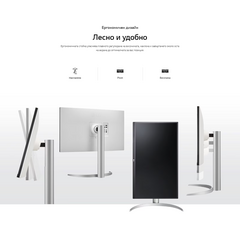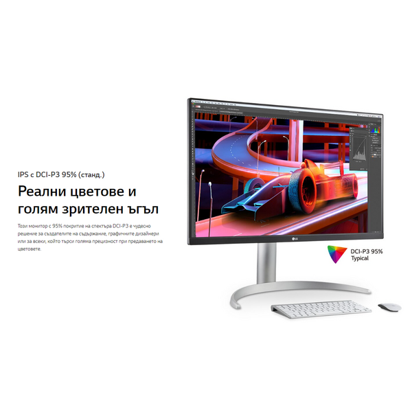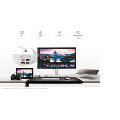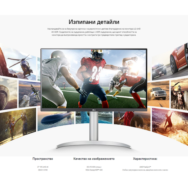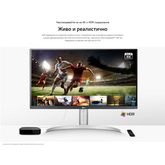 Наслаждавайте се на безупречна картина и на реалистични цветове благодарение на монитора LG UHD 4K HDR. Създателите на съдържание, работещи с HDR съдържание, ще оценят способността на монитора да възпроизвежда яркостта и контраста при предварителен преглед и редактиране. Мониторът поддържа VESA DisplayHDR 400 с широкодиапазонна яркост и контраст, което позволява драматично визуално потапяне в най-новите HDR игри, филми и изображения. Мониторът LG UHD 4K HDR практически може да преобразува стандартното съдържание във видеосъдържание с HDR качество директно на екрана. Той спомага за подобряване на транслирането на тоновете и осветеността на SDR съдържанието, за да осигури качество, подобно на това при HDR. Този монитор с 95% покритие на спектъра DCI-P3 е чудесно решение за създателите на съдържание, графичните дизайнери или за всеки, който търси голяма прецизност при предаването на цветовете. 27UP85NP разкрива нова ера при играта на 4K HDR игри на конзоли, като не само носи тръпка с чудесната си картина и звук, но и ви помага да печелите битки с AMD FreeSync, Game Mode (Режим за игри), Dynamic Action Sync (Динамично синхронизиране на действието) и Black Stabilizer (Стабилизатор на черното). Благодарение на технологията AMD FreeSync геймърите могат да се насладят на безупречно плавно движение по време на игрите с висока разделителна способност и висока динамика. Тя практически намалява накъсването и трептенето на екрана. Black Stabilizer (Стабилизатор на черното) помага на геймърите да избегнат снайперистите, криещи се в най-тъмните места, и бързо да избягат от напечени ситуации със затруднена видимост. HDR съдържание от множество стрийминг услуги. И възможност да се насладите на реалистична яркост и широк цветови диапазон при игра на LG UHD 4K монитор с технология VESA DisplayHDR 400 при поддържане на цветово пространство DCI-P3. Ергономичната стойка улеснява плавното регулиране на височината, наклона и завъртането около оста на екрана до оптималната за вас позиция.