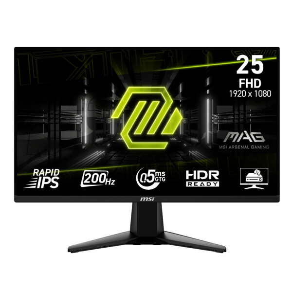 Монитор MSI MAG 255F E20, 24.5", 0.5ms, 200Hz, Rapid IPS, 1920x1080 (FHD), 16:9, AMD FreeSync Premium, 79% DCI-P3, AG, HDR Ready, 300 nits, 1000:1, DCR 100M:1, DP(1.2a), 2xHDMI 2.0b, Tilt, VESA, Black, 3.24kg