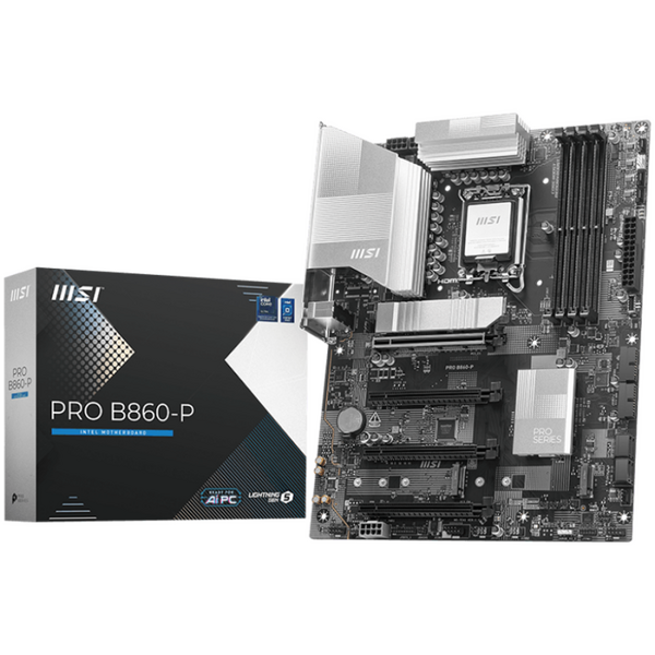 MSI PRO B860-P, ATX, LGA 1851, 4x DDR5 Dual Channel DDR5 up to 8600(OC)MHz, 4x PCIe x16 slot, 3x M.2 slot, 4x USB 2.0, 2x USB 5Gbps, 2x USB 10Gbps, 1x USB 40Gbps Type-C, HDMI, DP, 7.1 HD Audio, 5G LAN, 3Y