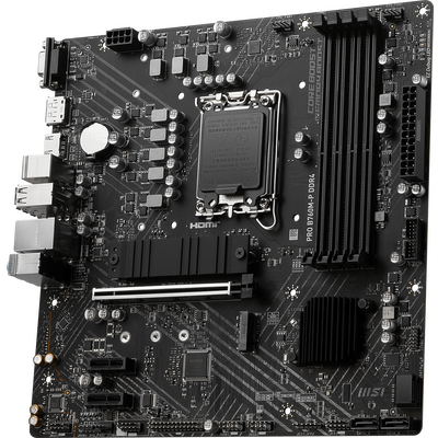 MSI PRO B760M-B DDR4, mATX, Socket 1700, Dual Channel DDR4 4800(OC)MHz, 1x PCIe x16 slots, 2x M.2 slots, 1x HDMI, 1x DP, 1x VGA, 1x USB 3.2 Gen 2 Type-C, 1x USB 3.2 Gen 1, 4x USB 2.0, 2x ARGB Headers, 7.1 HD Audio, 1Gbps LAN, 3Y