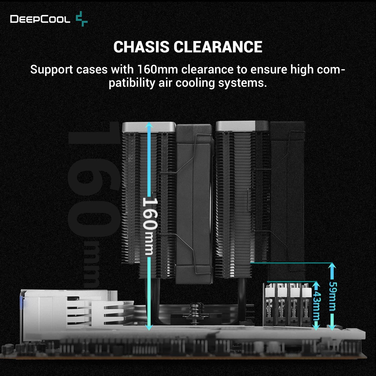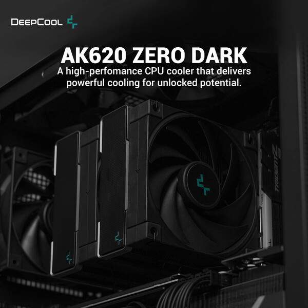 The DeepCool AK620 ZERO DARK is an all-black edition of the dominant AK620 high performance CPU cooler. The same premium quality materials featuring six advanced copper heat pipes, a dense dual-tower heat sink, and two silent FDB fans produces a powerful winning formula for high performance cooling in a ZERO DARK raven design.