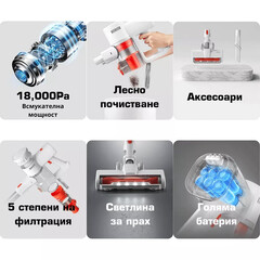The built-in high-speed brushless motor provides a suction power of up to 18,000Pa, allowing it to easily remove particles, even from hard-to-reach places.