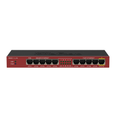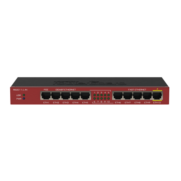 The RB2011iL-IN is the most basic model, with five Gigabit ethernet ports, five Fast ethernet ports, power jack and PoE support.