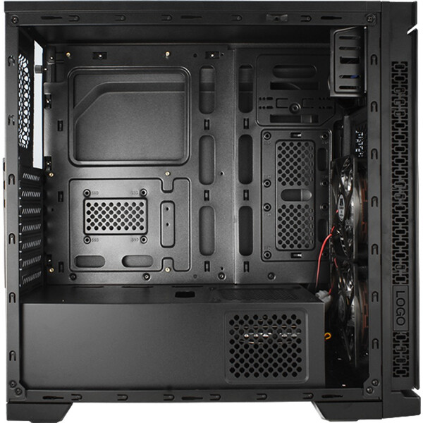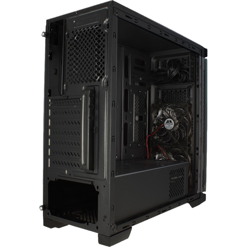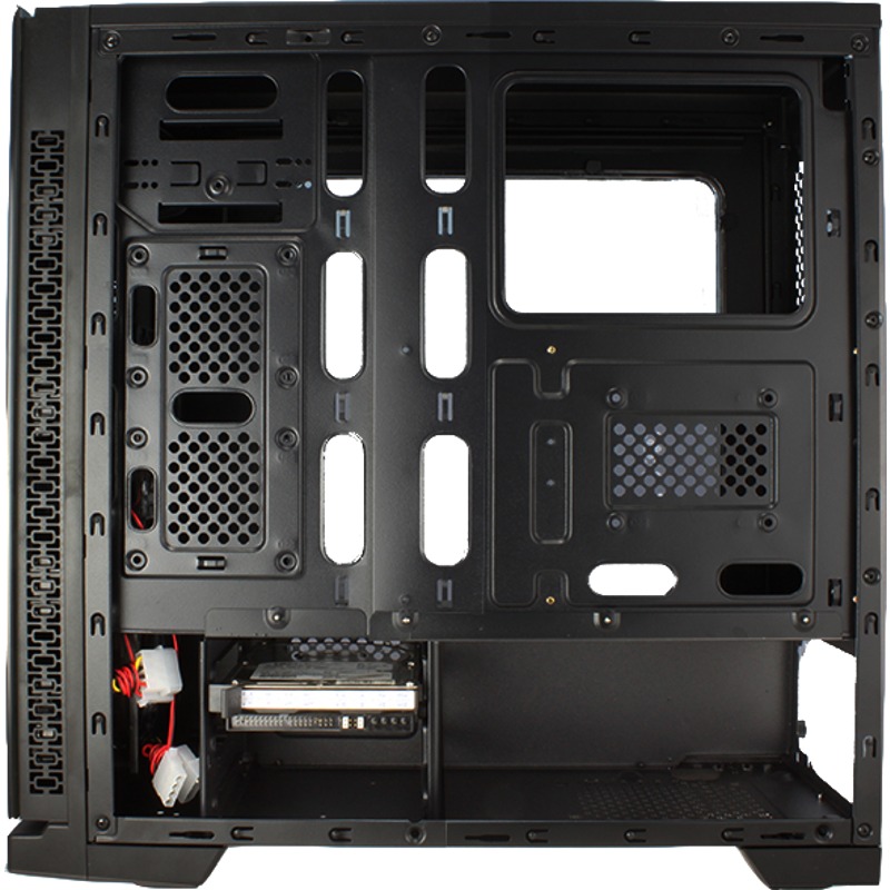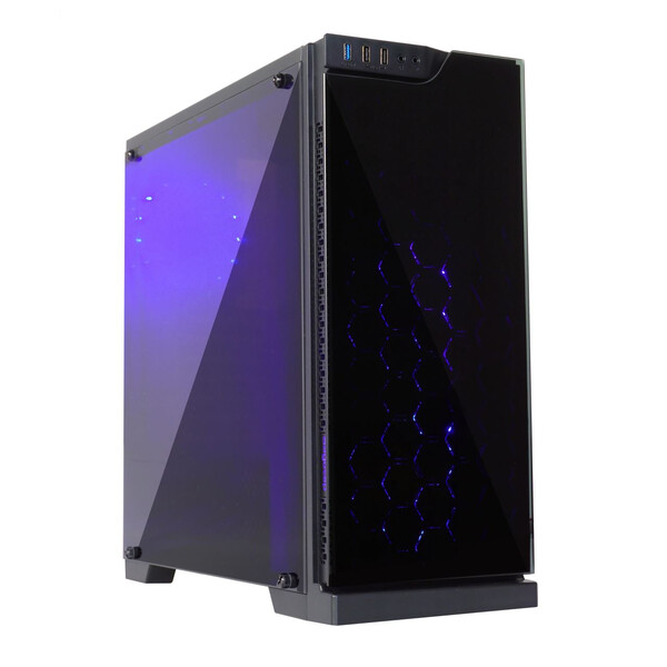The front panel is equipped with one USB 3.0 port, two USB 2.0 ports and HD Audio, and the side panel has clear glass to monitor the inside of the system.