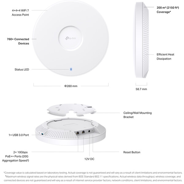 AP9778, the Omada Pro BE19000 Ceiling Mount WiFi 7 Access Point, provides up to 19 Gbps speeds with the latest WiFi 7 technologies. Two built-in 10G Ethernet ports ensure high network throughput. High-density environments will no longer be a hindrance.