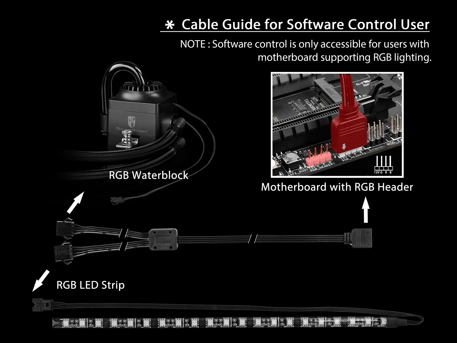 Software ControlIf you have motherboard supporting RGB lighting, then software control is accessible for you by simply plugging the RGB connector included into the RGB Header on your motherboard.