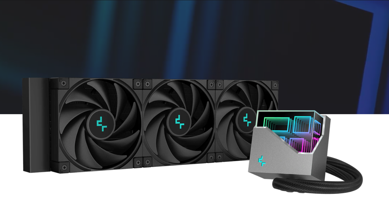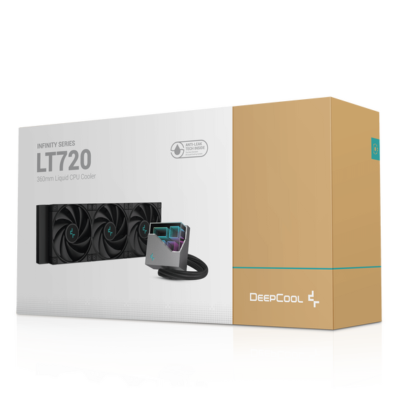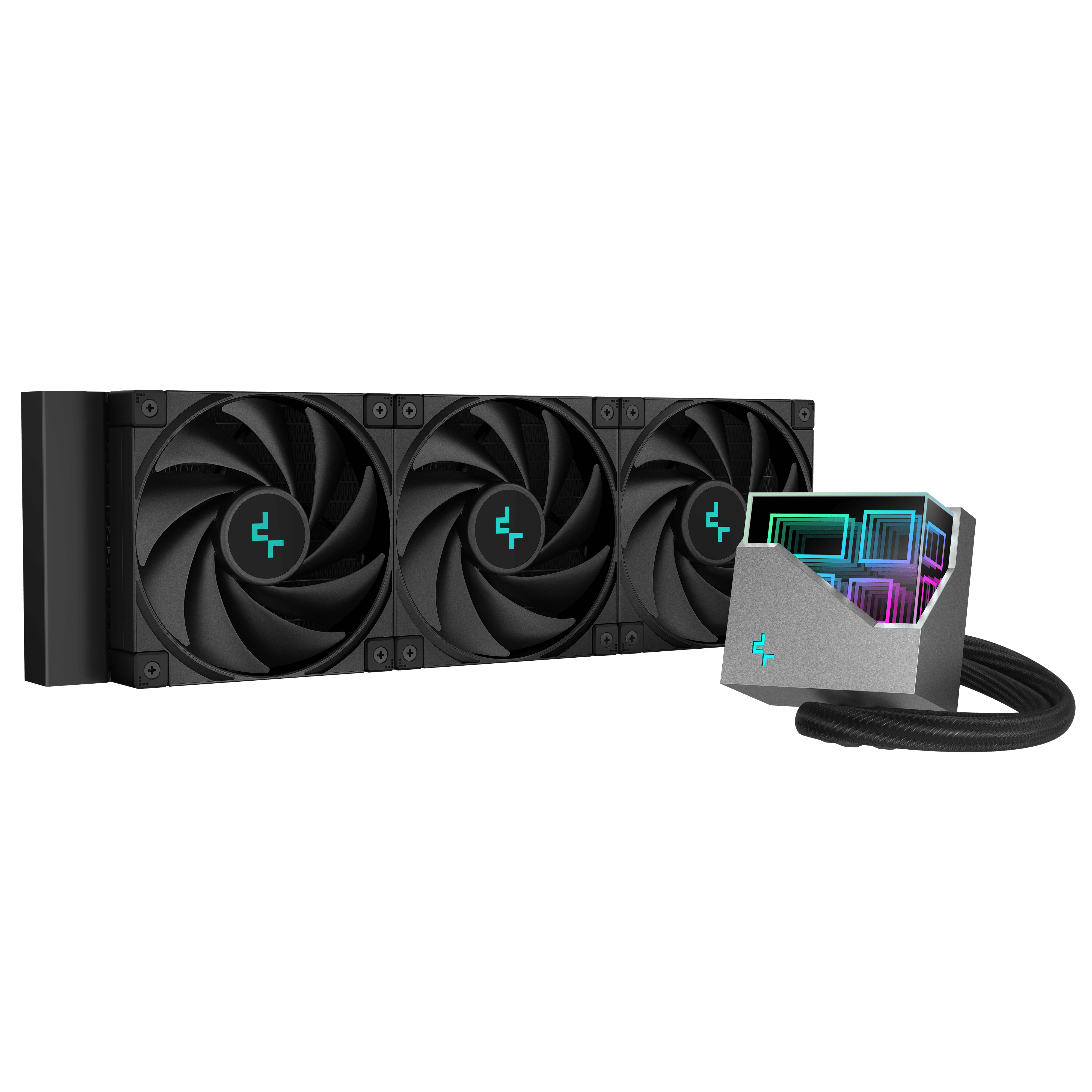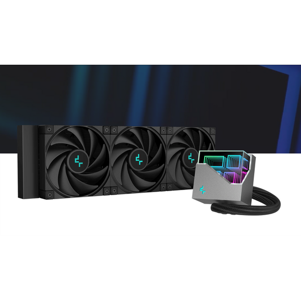 The DeepCool LT720 high-performance liquid CPU cooler provides strong heat dissipation power with a 360mm radiator, three precision-tuned FK120 fans, and a multidimensional infinity mirror top cap.