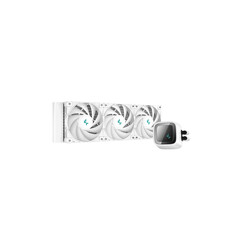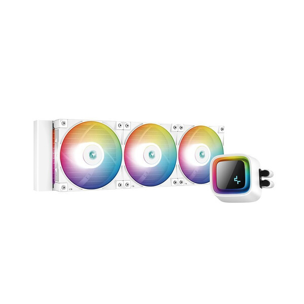 The DeepCool LS720 WH premium liquid CPU cooler maximizes cooling performance and low-noise efficiency with a 360mm radiator, three FC120 A-RGB PWM fans, and an infinity mirror cap design.