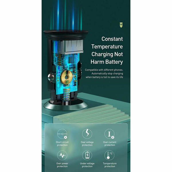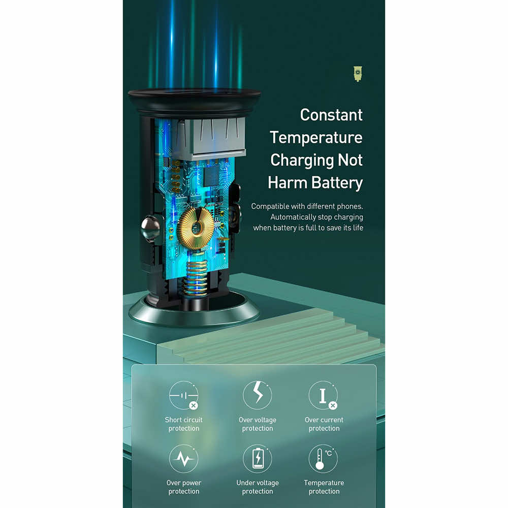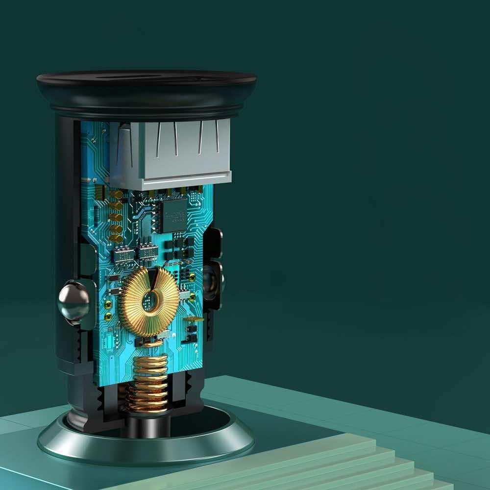 - Car charger with USB-A and USB-C outputs, both with fast charging technology